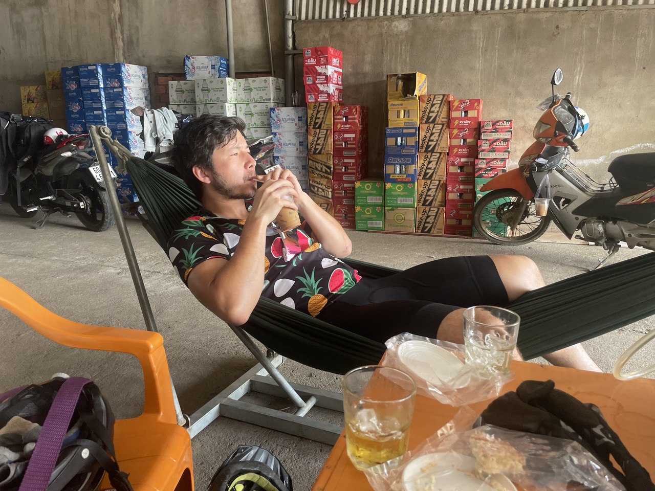 We ran almost the entire 5 km back to our bikes to avoid the land leeches, but we still got three each. At that point, it was midday, very hot (30 degrees and humid) and there were no more monkeys - the entire jungle seemed to have gone to sleep. We were so sweaty, and we biked back to the ferry in a hurry. When we got back to our hotel we took a cold shower to cool down, checked out of the hotel with almost no money left (160,000 vnd or about $8 CAD) and started biking in the absolutely asphyxiating heat. We biked about halfway along the QL20 (basically another highway, unlike our beautiful DT725 back road), then stopped to take out more cash and get water. The ATM lineup took 45 min, so had to bike the last 47 km in 2 hours to avoid biking in the dark. There was absolutely crazy traffic, honking, etc. Max was ahead forcing his way through the throngs of motorcycles and cars, and luckily I could always see tall Max’s fruit jersey on his tall bike in the sea of motorcycles. Signals are absolutely meaningless here, and most motorcycles just drive along with their signals on because they have forgotten to turn them off. I basically signal for Max’s benefit, because I am usually navigating and want to give him advance notice that we are making a turn, and Max signals to “take the lane” when he is avoiding an obstacle, which is terrifying. I told him we are going to get beat up and he said “I am by far the biggest person here!” I had to point out that we are also the only non-motorized vehicles on the road, even if most of the motorcycles sound like old lawnmowers.